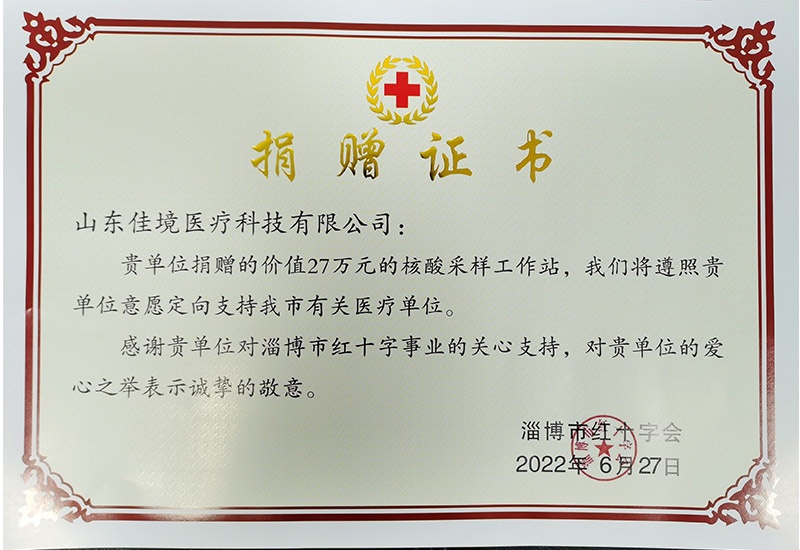 6月27日下午,山東佳境醫(yī)療科技有限公司向淄博市紅十字會(huì)捐贈(zèng)用于抗擊新冠病毒的核酸采樣工作站11臺(tái),總價(jià)值27萬元,支援我市疫情的防控工作。淄博市紅十字會(huì)二級(jí)調(diào)研員劉永鋒、佳境醫(yī)療董事長鐘文泉先生出席捐贈(zèng)活動(dòng)。劉永鋒表示:“非常感謝佳境醫(yī)療的無私捐贈(zèng),這是一次積極向上、回報(bào)社會(huì)的愛心行動(dòng),對(duì)廣大企業(yè)積極參與抗擊疫情、履行社會(huì)責(zé)任將起到示范作用。鐘文泉表示:“臨近七一建黨節(jié),作為一名黨員,一定要響應(yīng)黨和政府的號(hào)召,盡自己的綿薄之力,向所有抗疫一線的醫(yī)護(hù)人員表示敬意”。